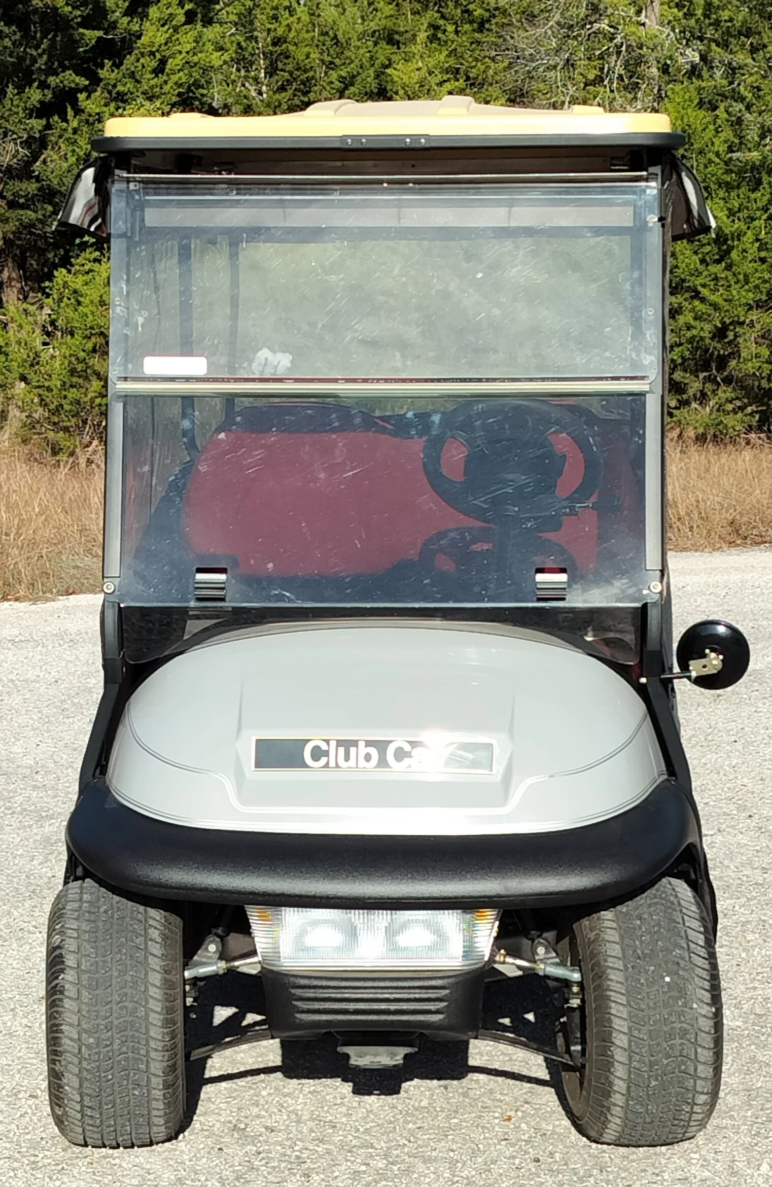 Club Car Precedent. Cart is street ready, has front and rear lights, turn signals, horn, four-way flashers, driver and passenger side mirrors, SMV sign, 18-8.5/8 tires, SS wheel covers, front flip down windshield, weather enclosure, rear flip down seat, comes with automatic on/off charger.