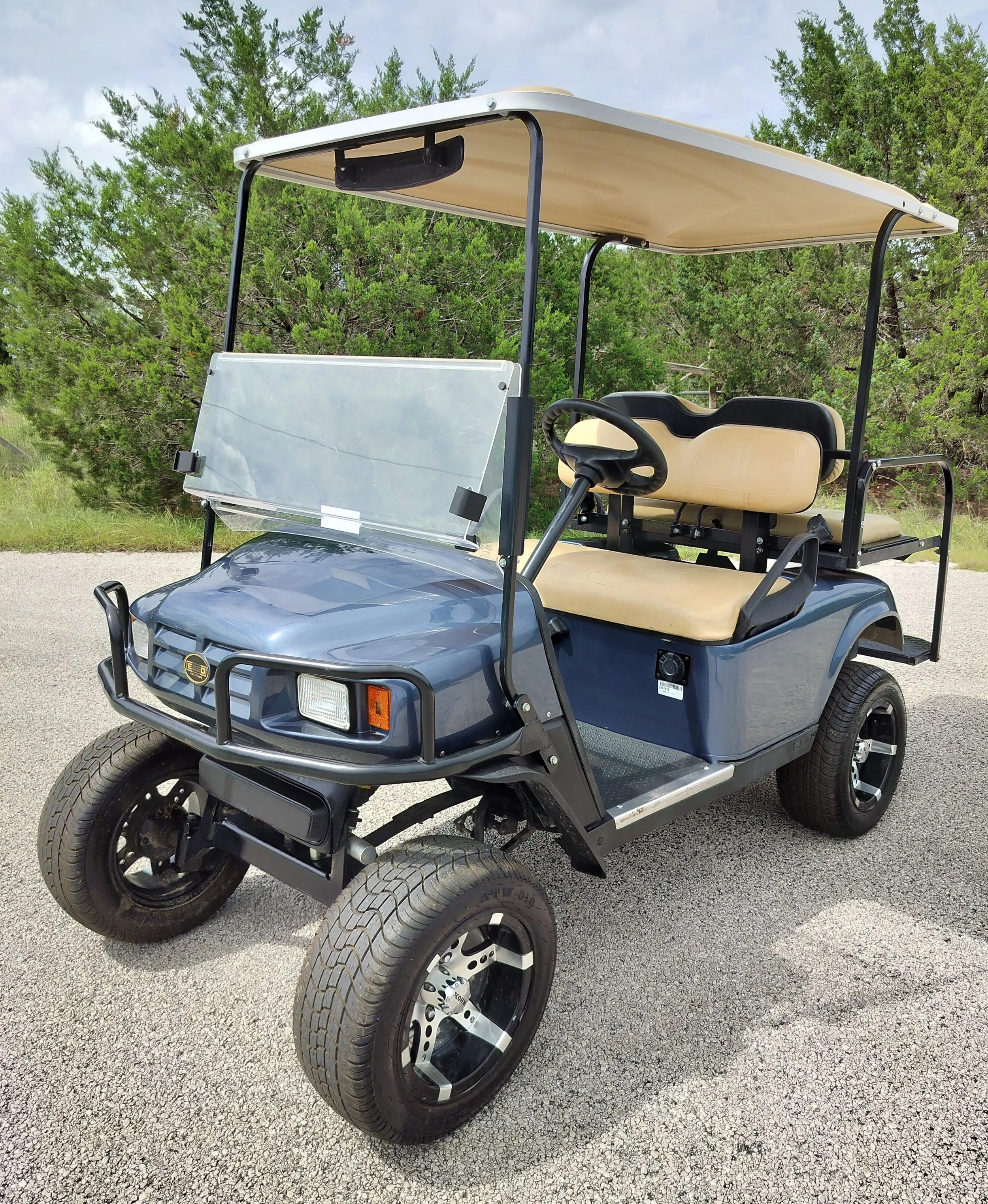Lifted Golf Cart, cart has headlights, front and rear seat belts, dash mounted battery strength indicator, front brush guard, rear flip down seat, rear cargo box, high low speed, 20X10-10 all-terrain tires, diamond plated roof, dash mounted 12V power outlet.