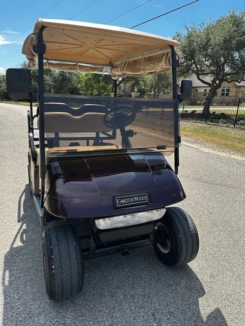 Purple "Woody style" Club Car Precedent 48-volt electric six seater limo cart, street legal top speed 17-18 MPH. Cart has brand new batteries installed today (11-30-22). Six inch heavy duty lift kit, 22x10.5-12 alltrain tires on SS alloy wheels, rear flip seat with grab bar, brand new paint and upholstery, two tone seats, front and rear LED lights, turn signals, brake lights, horn, over head front LED light bar, custom dash with locking compartment, two USB dash mounted plugs, dash mounted battery strength indicator, six speaker bluetooth sound system, tinted front flip down windshield, custom over size chrome steering wheel, rear safety triangle, 116" extra long heavy duty roof covers all passengers), driver and passenger mirrors, comes with automatic on/off battery charger.